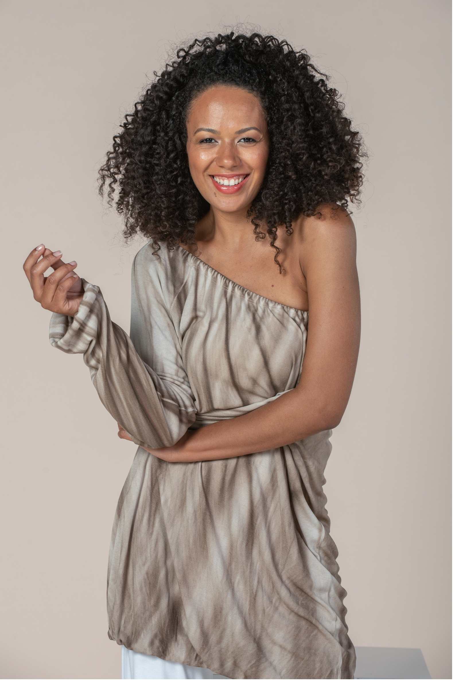 Classy long tunic – sweatshirt or even a stylish short dress. The elastic shoulder line, sleeves and hem invite you to play with style and length. Exclusive print in natural hues. A truly lovely and versatile addition to your sustainable wardrobe.